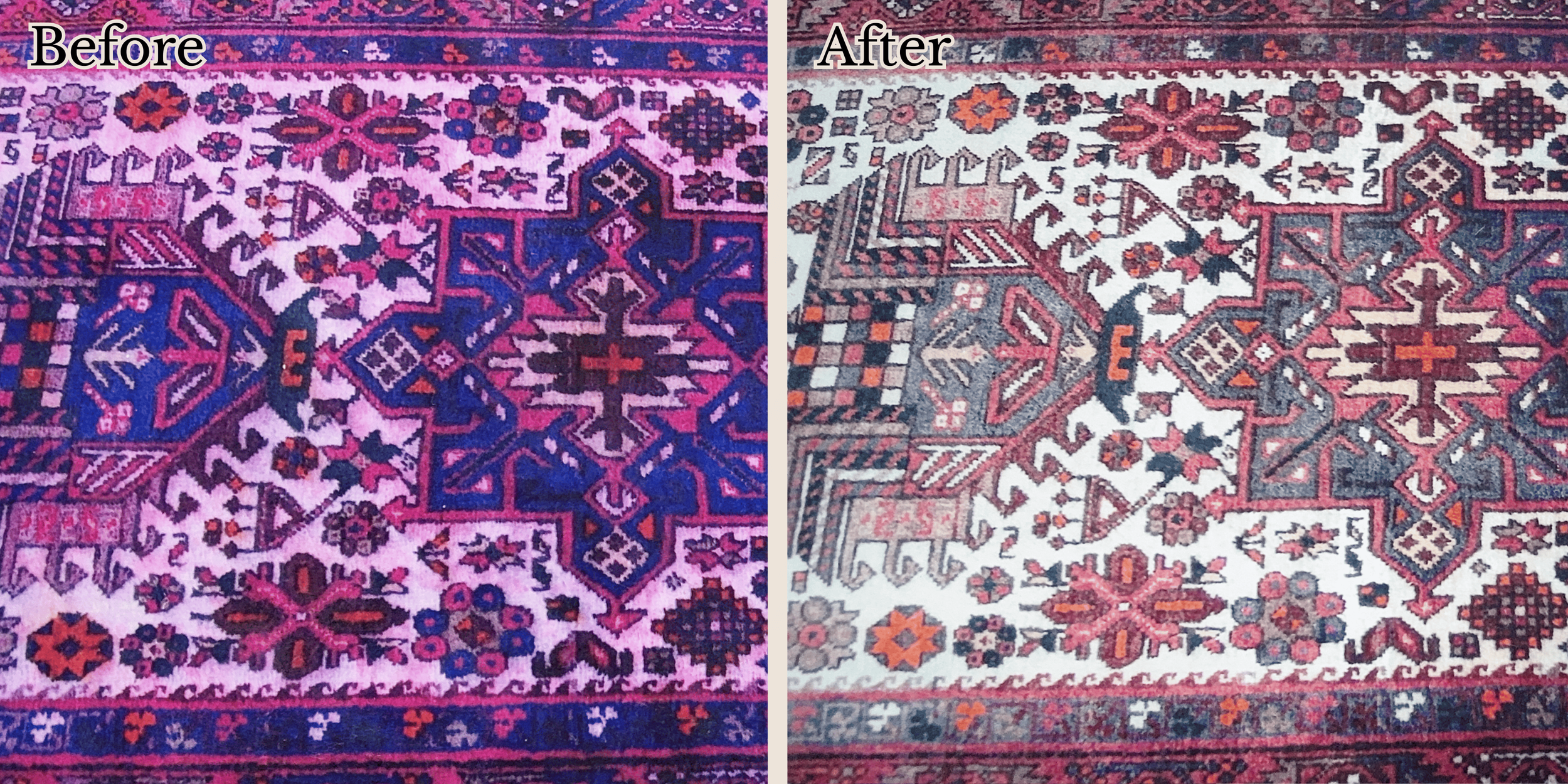 Each rug is evaluated individually. Cleaning methods and results depend on fiber type, dyes, age, and condition.